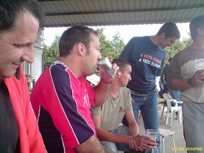 Subcampion de 2ª División tempada 08-09 Equipo Menos goleado O Clube Deportivo da Feira conseguiu esta tempada o ascenso a 1ª división da liga de Aficionados que organiza Sociedade Deportiva de Salceda de Caselas, proclamandose Subcampion da 2ª División, e proclamandose tamen equipo menos goleado do campionato. Celebramos este meritorio logro, todos xuntos coas nosas respectivas parellas, disfrutando dunha churrascada con salpicon incluido e gran variedade de postres, todo regado con moito viño e moita variedade tamen de chupitos. Acollidos da choiva na nave do Miguez, pois o tempo non acompañou e non poidemos quedar nos Agüeiros. A esta churrascada so saltarón, Enri, Fran, Carlos, José Aros e Pereira. Buscamos un bo dianteiro para a temporada 09-10 e tamén un porteiro, si realmente eres un fenomeno ponte en contacto con algun xogador do equipo. De esquerda para dereita, en pé: Juan Pablo (de puntillas) Cristian, Gaspar, Carlitos, David, Rigo, Manuel Angel, Rocha, José Aros, Zacarias (o tropical), Kike e Enri. Abaixo: Oscar, Martin, Rubén, Míguez, Josiño, Juli, Hector, Manolo, Juan e Jose Falta: Francisco, Carlos e Pereira